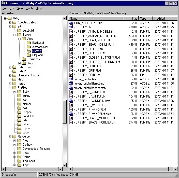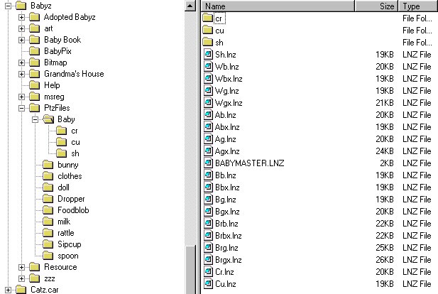 This is part of my "Ultra-easy" editing range; this package includes all that you need in order to create new babyz easily, using only Notepad, Wordpad and either Windows Explorer or My Computer! Woo-hoo! NOTE: You do have to read the included text files carefully and follow the instructions, or the method won't work for you. Click here to see a screengrab of my Babyz directories in Windows Explorer, so you can see where the .lnz files are supposed to go if you're confused. The icon beside the .lnz files are Notepad ones because I used Windows Explorer's View -> Options -> File Types menu item to Associate the .lnz extension with Notepad.exe.
