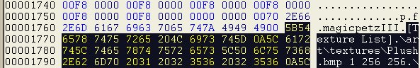 (Note, I would only change the sounds line if I'm keeping the sounds internal. Actually I'm in process of making all my sound-stripped breedz un-mute by redirecting the sounds to the hard drive, so I would keep the \ptzfiles\dog\pd\pdsnd.txt azis, but if you want it to pick up internal sounds you need to change it to \ptzfiles\dog\pp\pdsnd.txt) Okay, now I open the Poodle-based file into my hex editor and find this section: