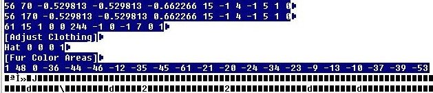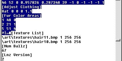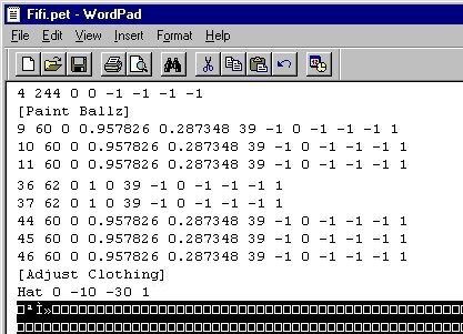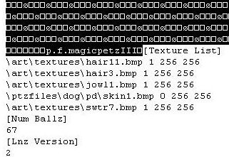 Now you've got to get your pet's raw .lnz data into a form that you can edit easily. If you were to open it into Notepad at this stage, you'd see a whole load of numbers and squares, like this but with black squares instead of white: [Texture List]\art\textures\hair11.bmp 1 256 256\art\textures\hair10.bmp 1 256 256[Num Ballz]67 and lots more. in other words, a great slab of numbers that makes it difficult to see what to edit. What you should do is see it as it should be, a series of lines and columns of numbers, so you want to replace the black squares (which are really Line Feeds -- Hex 0A) with Carriage return/Line feeds -- Hex 0D0A. Once again, there are at least two methods for doing this. I mention here the three methods that I tend to use.