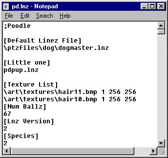 We're nearly done. You have a small amount of editing to do in Notepad. Remember, we are using a poodle for this example, and its 2-letter mnemonic is pd. Click here for the 2-letter mnemonics for the other base dog and cat breedz Once again, open pd.lnz in Notepad. put your cursor at the beginning of the file in front of [Texture List] and press Enter to make a new line. Now you want to insert into that new line these lines of code: