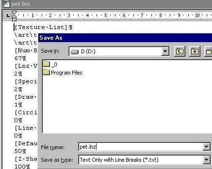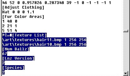 Okay, if you used one of the first two methods in the Third section of this Howto (hex editor or Word) you now have a single .lnz file. You need to split it into two. the easiest way is to right-click on the file in Windows Explorer or My Computer and copy it to the same directory; you will then have "pet.lnz" and "Copy of pet.lnz". Rename pet.lnz to (in the case of the poodle) pd.lnz and rename the copy to pdpup.lnz. This will be different depending on what the pet's breedfile is. You can tell what two letters to use by looking for [Sounds] in the .lnz; it will have something like \ptzfiles\dog\pd\pdsnd.txt. It must be the same as the two letters in the breedfile, which you can see in the "List of all that's in the file" for the poodle that I showed you above in this "howto": 00055888 5000 4400 0500 5000 4400 5000 5500 5000 P.D...P.D.P.U.P. Now open pd.lnz and find, somewhere near the middle of the file, where you see [Texture List] again. There will be a few weird characters in front of it. Put your cursor in front of those, select from there to the end of the file, delete and save (not Save As). See my screengrab below, it shows you the start of the selected area to delete in my chosen LNZ.