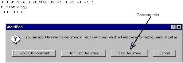 Save. Right, you're done -- you just have to put them into the correct place on your hard drive. As explained in my external lnzfiles "howto", you need to create a directory, off the game's root directory, thusly: \ptzfiles\dog\pd\ For people who have trouble understanding where to make these subdirectories in My Computer or Windows Explorer, look for where your game's .exe is; that's the root directory off which you need to make the ptzfiles one, and then you make the dog one off the ptzfiles one, and so on. Obviously for catz breedz, you would have to make it \ptzfiles\cat\ac (for the alley cat -- the 2-letter mnemonic would be different of course for other breedz) NOTE: The files _must_ have the extension of .lnz, not .lnz.txt, or this won't work. It's best if you make sure that the file extensions are visible in Windows Explorer (or My Computer); to do this, go to the View menu at the top, choose Options, and make sure that the "Hide MS-DOS file extensions" is _not_ ticked. You can then easily rename a file to have the correct extension by right-clicking on the file. Remember, the "pd" directory is different for other breedz -- "bd" for bulldog-based breedz and "ca" for Calico based breedz, for instance, and the "dog" is "cat" for catz breedz. In the case of the poodle, which is a little different from other breedz, you really want to have four .lnz files. As far as I recall off-hand, the poodle and Alley cat are the only two breedz who have "raw" copies of the adult and baby stages as well as the normal ones. It's just another kind of variation really. But anyway, to be correct in the Poodle the game expects to see these: