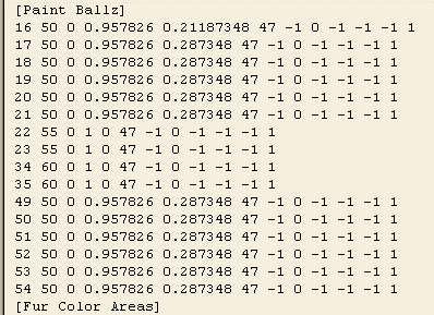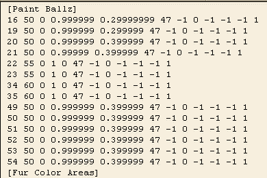 Okay, so you've added these into your .lnz file in Wordpad. Save. Choose the "Text Document" button when it asks how you want to save it. The number of bytes will now be all wrong of course, and the checksum way out. You've got a lot of work ahead of you... See why I say it would be better to make an all-new pet? That's how I'd do it usually, but my brief here is to show you how to put it all into one pet. So what you need to do now is find an area of the pet's .lnz where you can remove or change numbers without any real problems; and the [Paint Ball] area is the best place to try. If you haven't got any paint ballz in your pet, you can remove stuff from the [Linez] columns. I was lucky, there were some paint ballz: