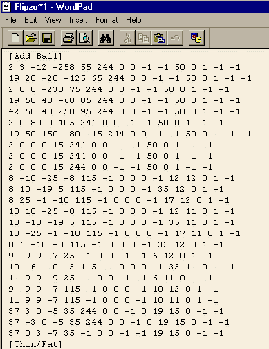 Copy it out to a new file inside the hex editor and save it as petfile.lnz. Now open the file into Wordpad -- it's free with Windows -- and I do mean Wordpad, not in this case notepad. Scroll down to the [Add Ball] area. In this example, the fangs will be added ballz number 92 and 93; you can tell this by counting down from the first add ball, which is always ball number 67, to the last add ball line. You'll see when you've finished counting that the last line is for ball 91.