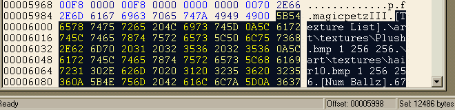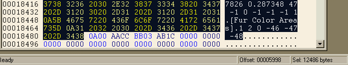 In this instance I decided the quickest thing was to remove two lines of code from the paint ball area. It doesn't have to be done that way; you could, if you have a hex editor with no checksum facility, carefully remove individual numbers one by one and adjust as you go. It's just that I don't have much time, I have Hex Workshop which has a checksum-calculating facility, and I find it quicker to remove the correct amount of bytes in one chunk and then compensate for the checksum. So, I figure that two of the paw pads would probably not be missed, and I deleted those lines and hit Save, text Document. This made the file almost the correct length. Now, at line ends in a text document Wordpad puts hex 0D0A (carriagereturn/linefeed) instead of hex 0A (linefeed only). The next thing I had to do was to open the file into my hex editor and replace all instances of hex 0D0A with 0A. Not 000A -- just 0A, which brings the size of the file down by several bytes. If the file is still a few bytes too long or too short, I remove or add the correct amount of numbers at the ends of the long decimal-place numbers in [Paint Ballz]. Now I need to check the checksum. In this example the original checksum for the highlighted .lnz section was 05EE in this particular pet,