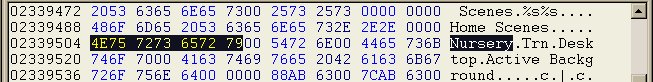 The only quirk to note with this fix is that, when the babies are ready to come out on their own, they will not actually become selectable until you either go to another playscene or you close the game and re-open it. I have had absolutely no weird effects at all with this fix, but on some machines I suppose it's possible that strange things may happen. So to avoid grief, make sure that you always make safe backup copies of your pregnant mums, and then of the mums with their new babies -- but of course I always recommend that you do that anyway, the game can corrupt pets even when you don't touch a thing. First of all, make a backup copy of your Petz 5.exe file and put it somewhere safe. This fix is incredibly simple, but things can go wrong, and you don't want anything to go wrong with your precious exe file! Now open your Petz 5.exe file into a hex editor. It does have to be a hex editor, I don't think that the newly-popular ResHacker can go this deep. Search for Nursery and make sure that the whole word is selected, as you see here