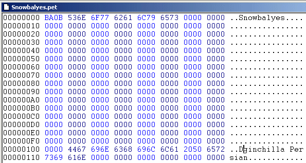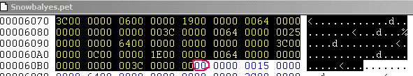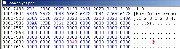 You have to have some knowledge of editing .pet files in a hex editor before you try this, also as always you will make sure you have a safe copy of the pet somewhere first, won't you? The byte you need to change is down in the section above the family tree data. Unfortunately that area is variable in size, even within the same pet after each save, and the new saved data goes in at both bottom of the section and in the area above it. So I cannot give an absolute address to find the byte, but I can give you a relative address. So this will be the simplest way to get you to the place: Search for YALP (NOTE: you have to have played with the pet at least once since adopting it or it will not yet have the letters YALP inside -- YALP is PLAY backwards, LOL)