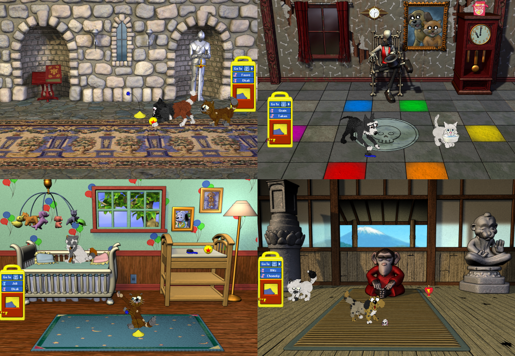 Petz 5 features a number of playscenes Petz 4 doesn't have. When someone requested a Petz 4 version of the Salon, it inspired me to recreate some of the other exclusive playscenes as well. And here they are! Clearly, these do not have minigames like the originals do. The package contains five playscenes: the Asian temple, the haunted mansion, the fantasy castle, the nursery, and the salon. Four of them are pictured in the screenshots below; click the image for a better view. To use these playscenes, simply put the .env files in the Rescource/Area folder in your Petz game.