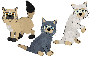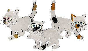The meezer-pointed calico is another common, highly variable type of pet. Basically speaking, they are poof-tailed calicos with siamese markings, but there are a few other possibilities. Note that the siamese muzzle consists of only the to top jowls, and doesn't cover the chin.
