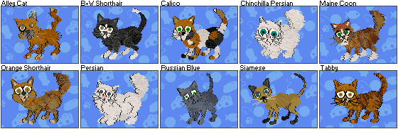 The Alley Cat is easy to discern by its angry, odd-sized eyes. The B&W Shorthair tilts its head backwards, with somewhat angry eyelids. The Siamese has the same angry expression, but tilts its head slightly forwards. It can also by recognized by its narrow, triangular face, which does not have the same big, round cheeks as the other breeds. The Calico and Tabby both hold their heads horizontally, with relaxed eyelids. Between these two, the calico has smaller eyes (the tabby's eyes are big enough to touch), but the muzzle balls are bigger. The Chinchilla Persian and Persian are the only pink-nosed breeds. Furthermore, the Chinchilla's face appears larger and more detailed in the "pick a pet" picture. The Maine Coon's eyelids are relaxed, and its head tilted forward. One if its eyelids is perfectly horizontal - the same is true for the B&W Shorthair, but this breed has an angry expression rather than a relaxed one. The Orange Shorthair has large eyes sporting a more or less relaxed expression, and a rather big nose. Its chin ball appears a bit misaligned to its muzzle. Finally, there is the Russian Blue, which is more turned towards the camera. It can be told apart from the Alley Cat (which is also turned towards the camera) by its relaxed eyelids.
