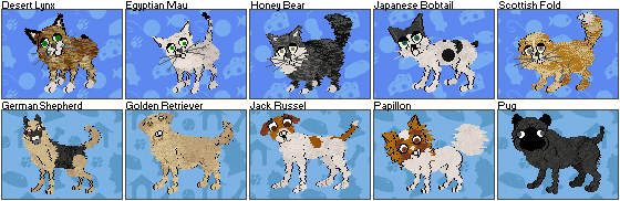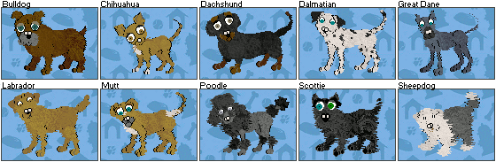 Unfortunately, the "pick a pet" image approach does not work so well for the Petz 5 breeds. This is because these breeds are based off of Petz 3/4 breeds, and, as such, pose the same way. In fact, figuring out which breed each of these is based on makes good practice! The only obvious exception here is the Pug, which can easily be told apart from the other breeds by its intense squint.